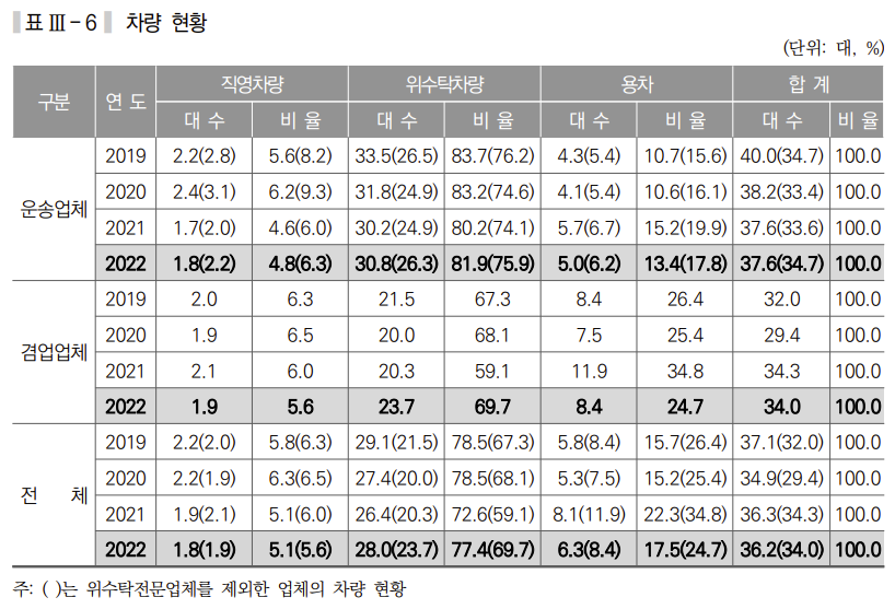 운송업체와 운송·주선 겸업업체의 직영 및 위수탁차량(지입차), 용차 사용 대수 및 비율 ⓒ한국교통연구원 |