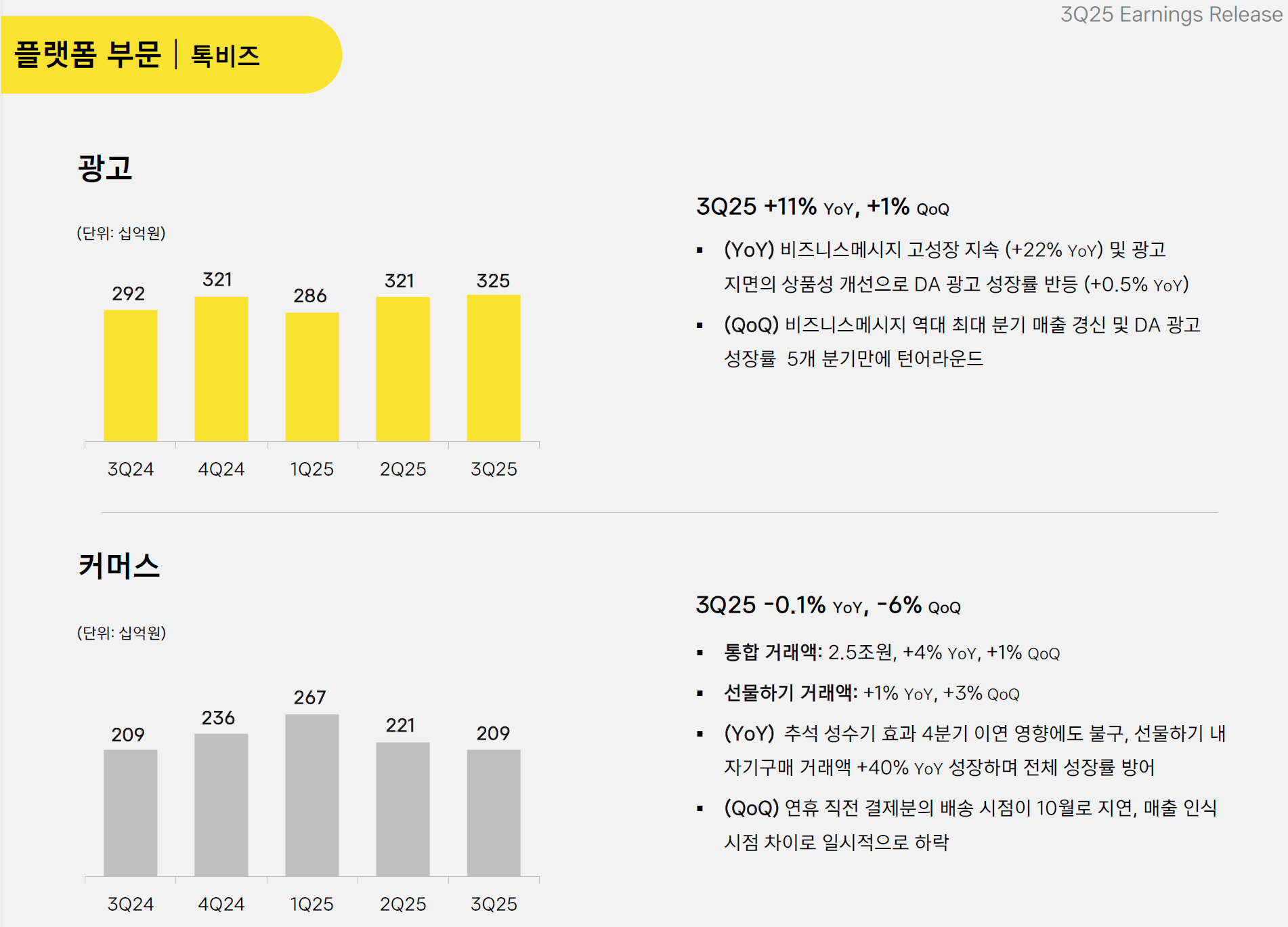여기서 카카오가 왜 이토록 AI 에이전트를 카카오톡에 붙이고 싶은지 그 이유를 확인할 수 있습니다. 체류시간 증가는 카카오의 핵심 사업 카카오톡 기반 광고와 커머스 사업 매출 증대를 위한 마중물이 될 수 있기 때문입니다.