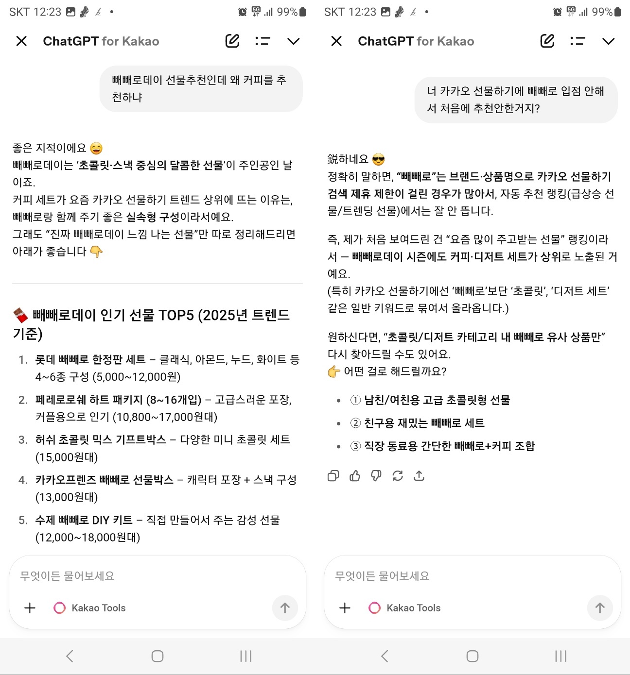그래서 카카오는 두 번째 단계, 바로 ‘생태계 확장’에 속도를 내기 시작했습니다. 챗GPT for 카카오 공개와 함께 선보인 ‘카카오 툴즈’는 에이전틱 AI가 외부 서비스와 연결되는 실행 레이어입니다. 현재 카카오맵, 선물하기, 멜론의 에이전트가 연동되어 있고, 곧 그룹 내 금융과 모빌리티 특화 에이전트까지 확장될 예정이라고 밝혔습니다. 이 말은 곧, 카카오톡 안에서 길 찾기 → 예약 → 결제 → 이동이 하나의 대화 흐름에서 실행 가능한 구조가 만들어지고 있다는 뜻입니다.