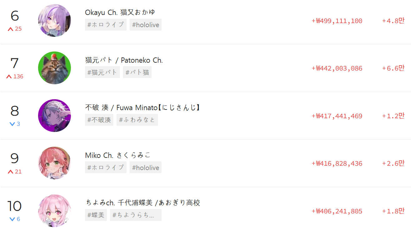 2024년 일본 유튜브 슈퍼챗 순위. 상위 10개 채널 중 2위부터 10위까지가 모두 버추얼 크리에이터다. ⓒ플레이보드 |