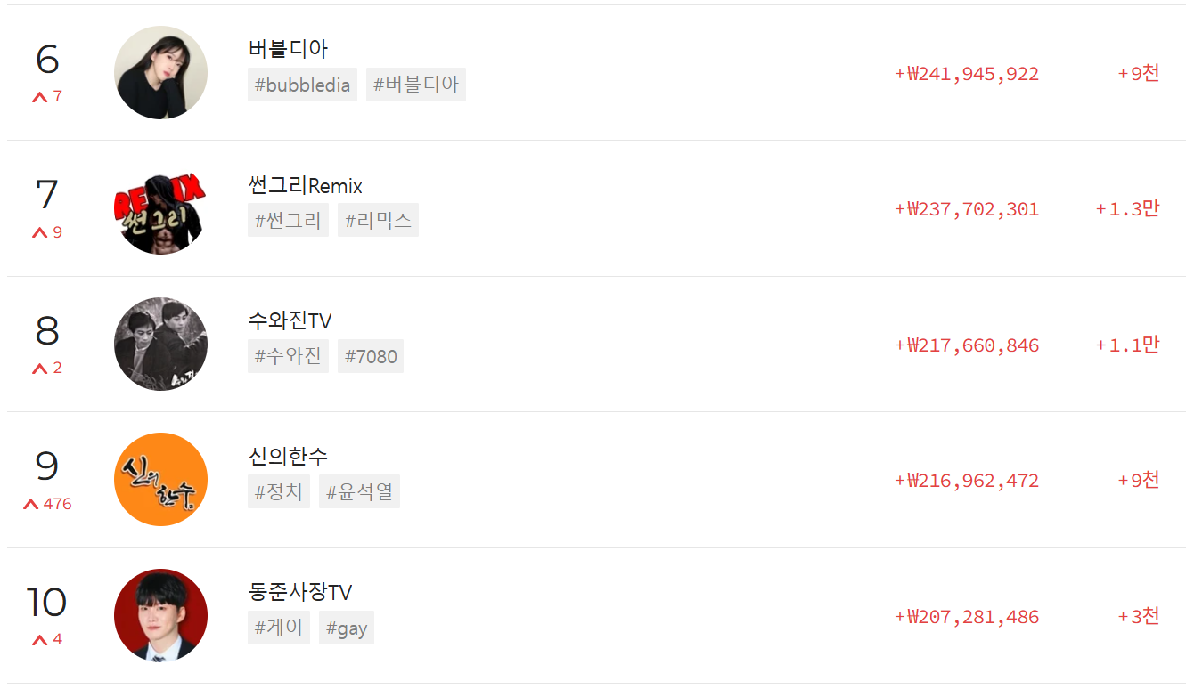 2024년 한국 유튜브 슈퍼챗 순위. 일본과는 달리 버추얼 크리에이터는 보이지 않는다. ⓒ플레이보드 |