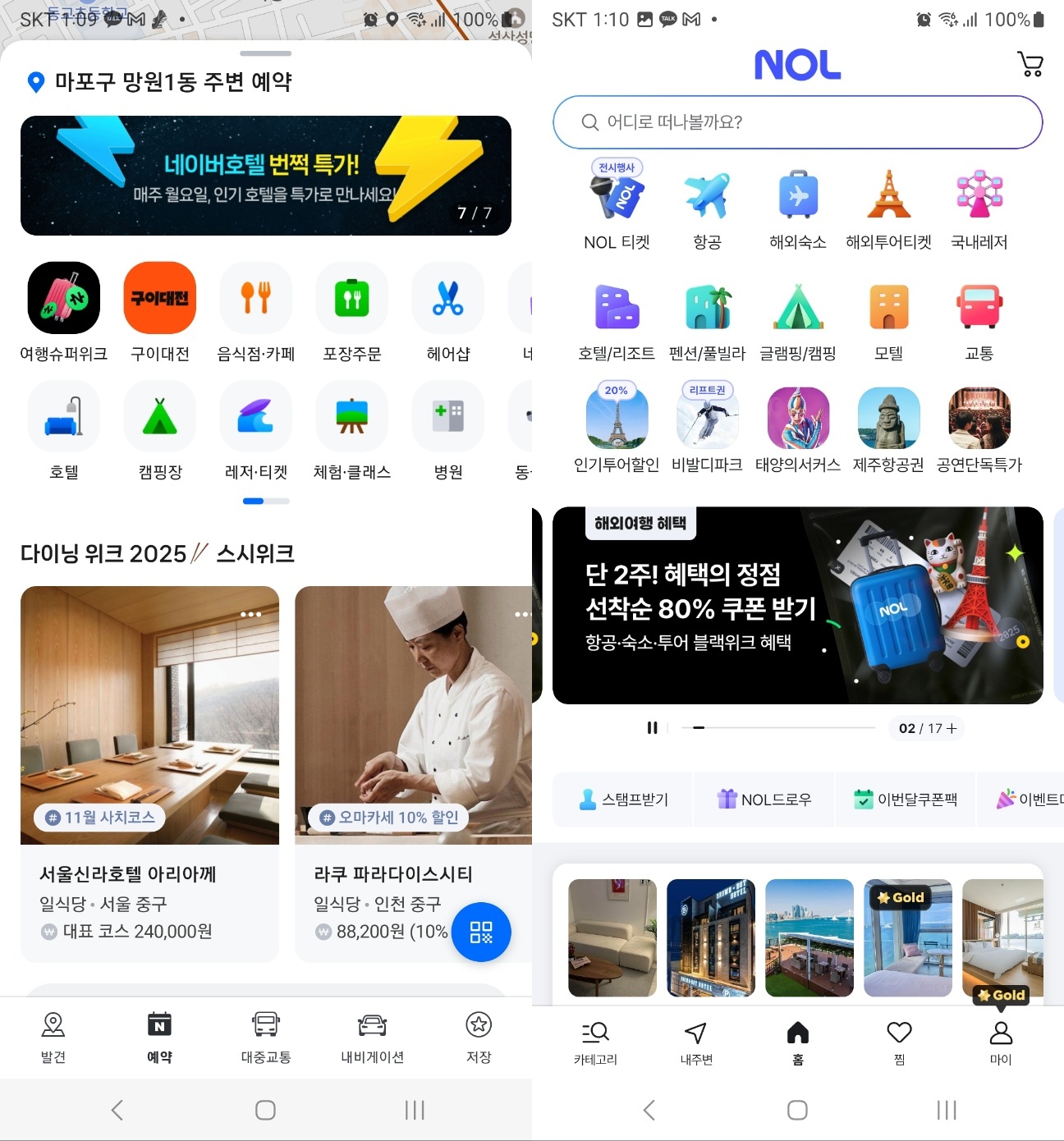 네이버지도 예약탭(왼쪽)과 야놀자(오른쪽)의 앱 메인 인터페이스 비교 |