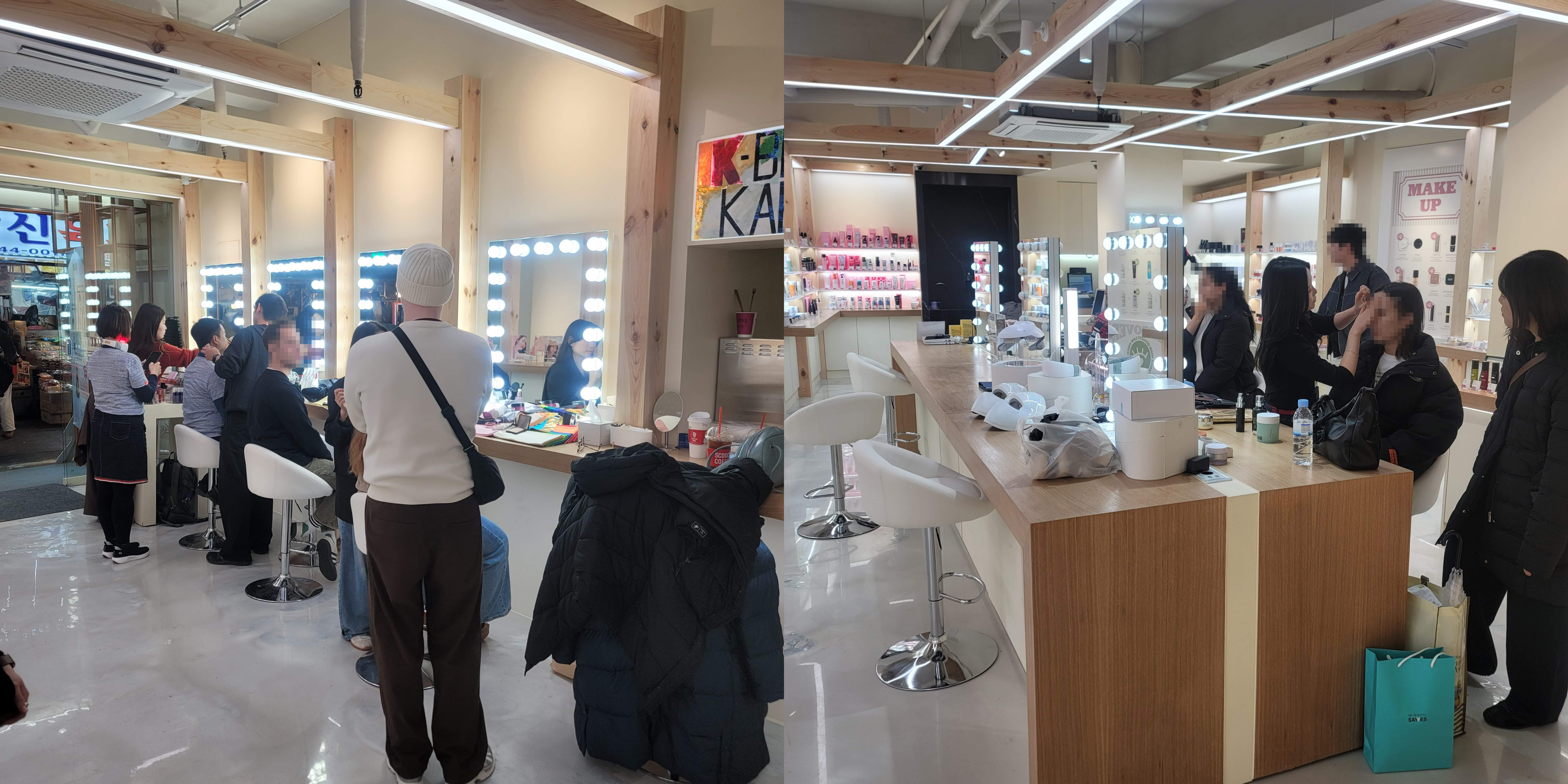 직접 방문한 매장 안의 분위기는 화장품점이라기엔 새삼스러웠습니다. 메이크업샵이나 뷰티살롱의 분위기에 더 가깝다고 할까요? 여러 사람들이 거울 앞에 앉아 직원들의 뷰티 케어를 받고 있었고요. 이들 대부분은 한국인이 아니라 다양한 국적의 외국인이었습니다. 한국인 남성인 저도 이러한 체험을 해볼 수 있는지 물었는데, 대기 신청을 하면 곧 가능하다는 답이 돌아오더군요. 개인 피부톤에 맞는 컬러 진단과 함께 메이크업을 함께 해주는 서비스를 무료로 제공하고 있던 겁니다. |