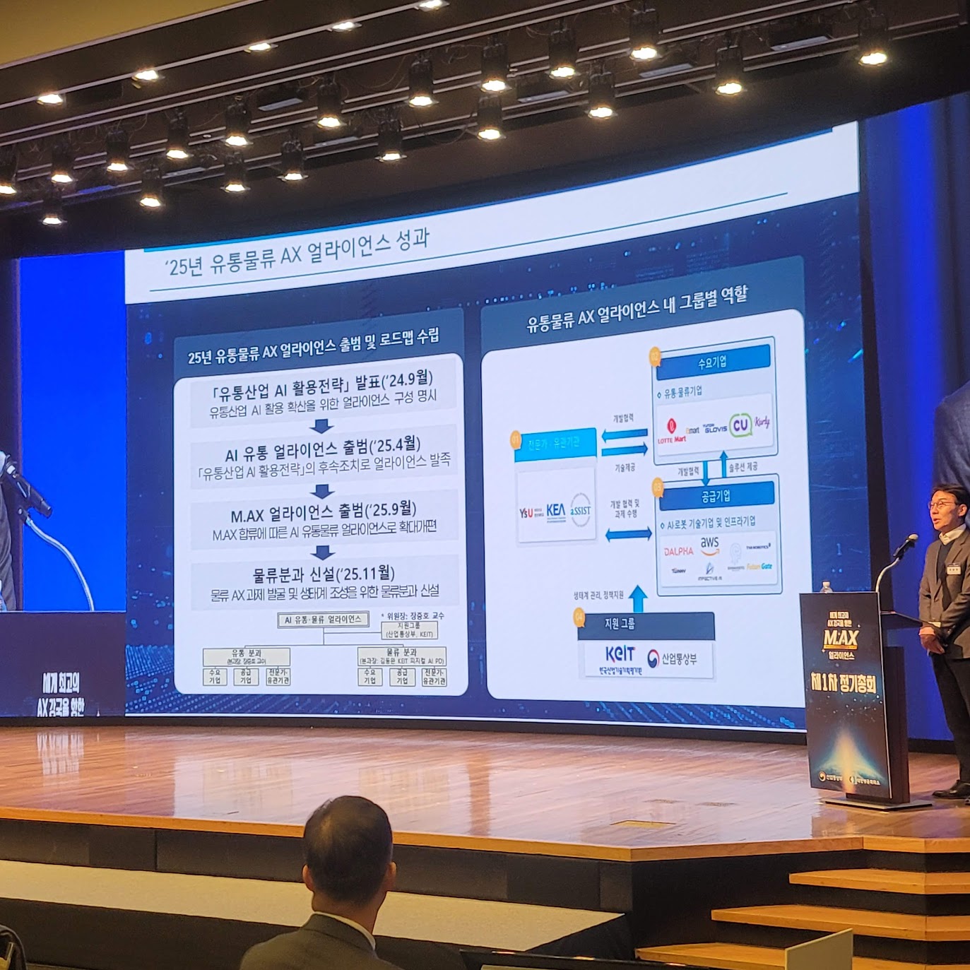장중호 위원장이 발표한 유통물류 AX 얼라이언스의 2025년 성과와 그룹별 역할. AI유통 얼라이언스는 맥스 얼라이언스 합류에 따라 ‘AI 유통물류 얼라이언스’로 확대 개편됐다. ⓒ커넥터스 |